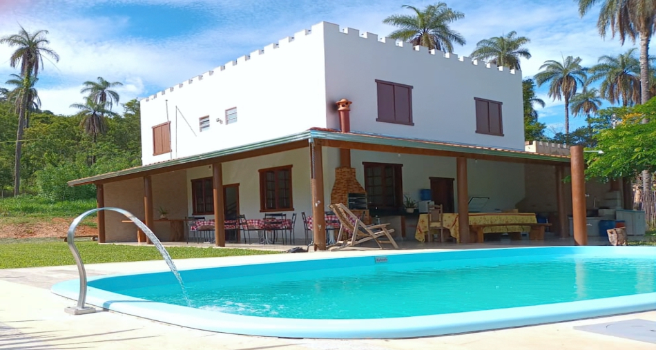Todos os quartos têm 1 cama de casal e 2 camas de solteiro. Em 5 dos quartos são 2 de solteiro normais. Em 2 quartos que são menores (02 e 04), tem 1 cama de solteiro com uma cama reserva embaixo. No 1º andar, além dos 3 quartos, ele tem 2 banheiros sociais, um ambiente amplo com funções de sala, copa e cozinha, totalmente mobiliado, contendo os utensílios básicos de cozinha, tais como panelas, pratos, talheres, copos, tem varandão em L em piso de granito, com churrasqueira, pia e bancada de apoio em granito. No final da varanda dos fundos tem tanque de 2 bojos e fogão a lenha. Possui uma piscina 8m x 4m rodeada por piso de granito claro. Em frente à casa, tem um extenso gramado que pode ser usado para a prática de esportes, possui rede de peteca e 2 minis gols, tem um Rio de águas claras a uns 150 metros da casa.